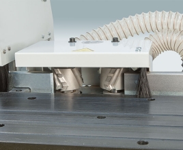 Unidad tupí de doble cabezal con plaquitas de diamante PCD. Garantiza un rectificado perfecto del canto de los paneles, proporcionando una superficie lateral perfecta para una aplacado resistente.