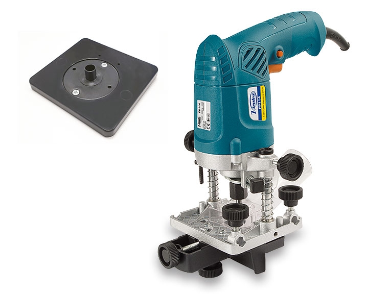 Incorpora regulación milimétrica para una fácil regulación. También permite el perfilado de cantos en piezas canteadas y el fresado de ranuras en madera o materiales plásticos. Incluye de origen una base accesoria con copiador para fresar copiando usando plantillas.
